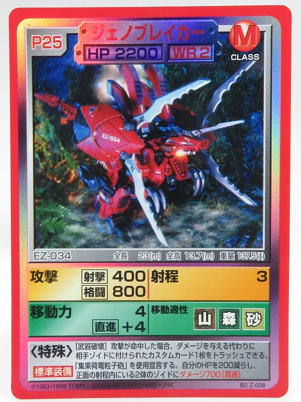 こちらはブースターパック2のゾイドカードで、M型にしてデスザウラーと同じ格闘攻撃力を持ち、移動適正は驚異の3地形持ちで、同じM型でもステータスの差が激しいことを示すいい例です。スターターパックのM型とは比べられない強さを発揮します。 | |