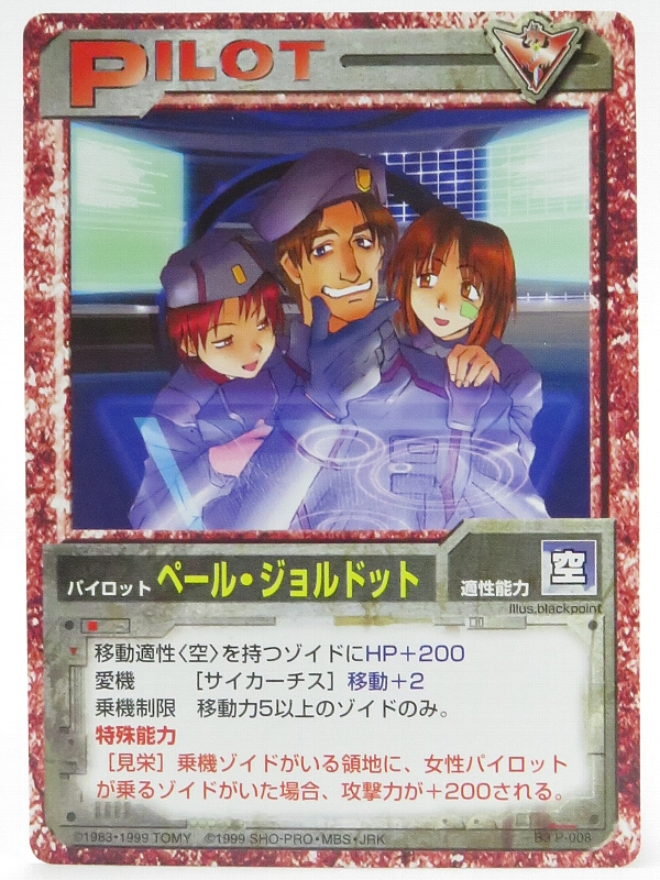 こちらはブースターパック3のパイロットカードで、移動力5以上の空適性ゾイド限定パイロットです。特殊能力「見栄」で自機の領地内に女性パイロットがいた場合は攻撃力が+200されます。 ちなみにバトストでは模擬戦でジェノザウラーの圧倒的な力に負け負傷しています。 |