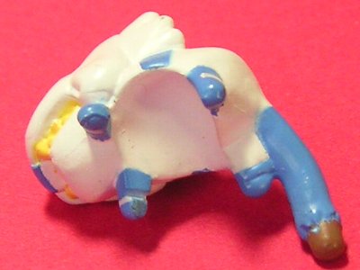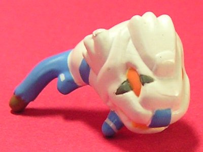 | ↑にゃいがーぶるーソウガ君。普段着版と違って体が可動しない代わりにミニフィギュアが付いています。体裏にクボミがあり、ミドリの右手にちょうど合うようになっています。ただ、凸部などがあるわけではいので少しの衝撃ですぐに落ちてしまいます。 |