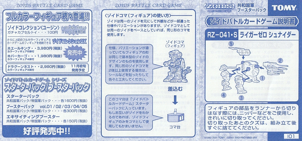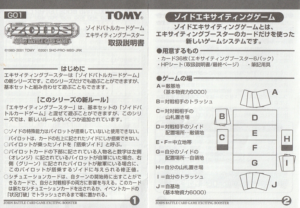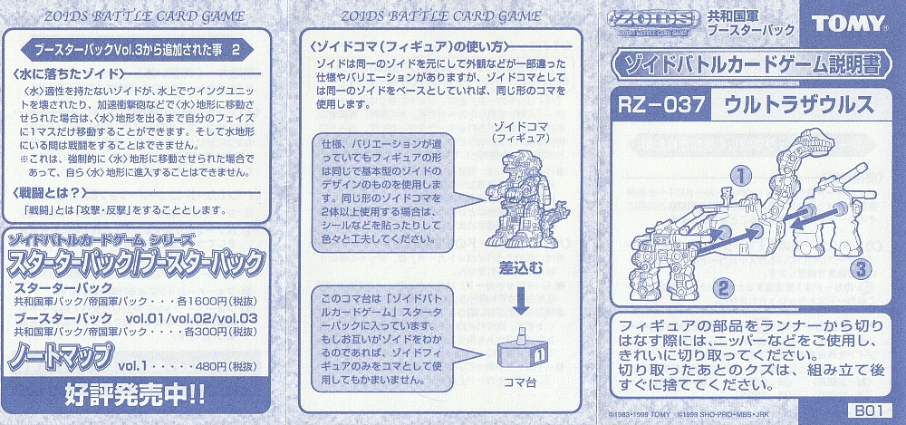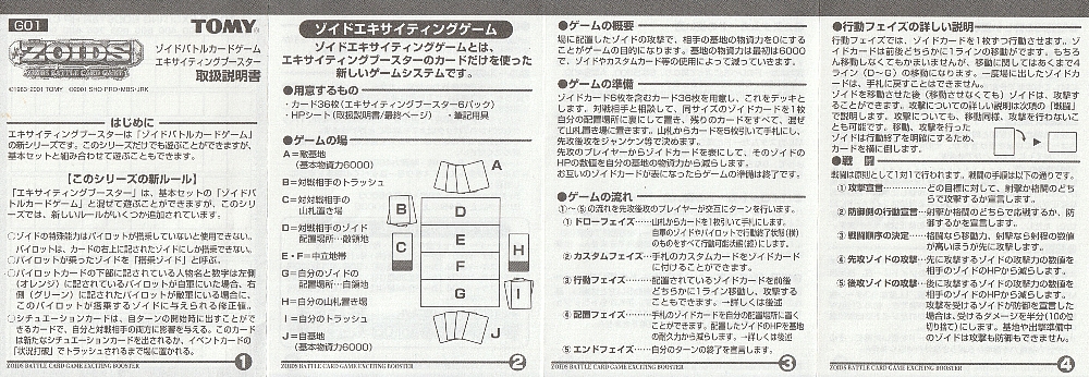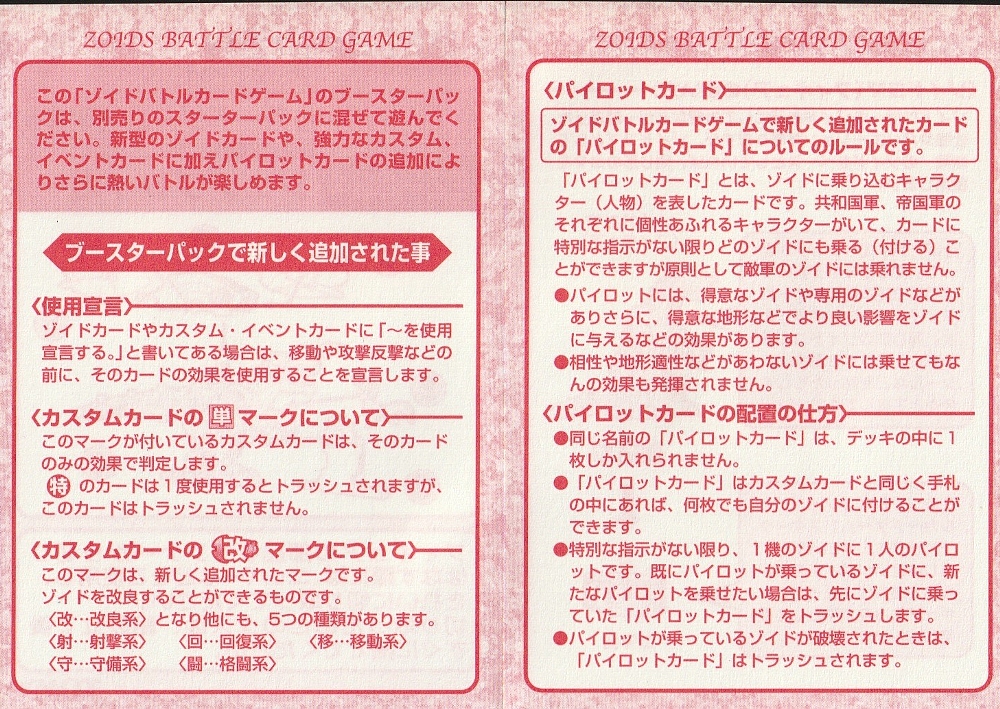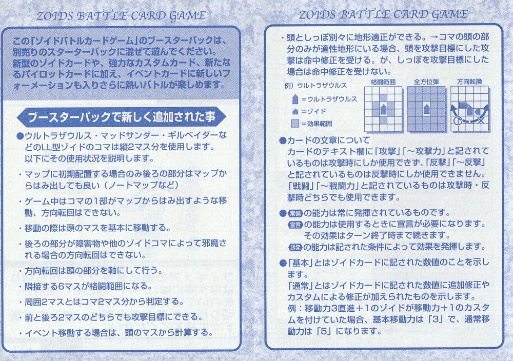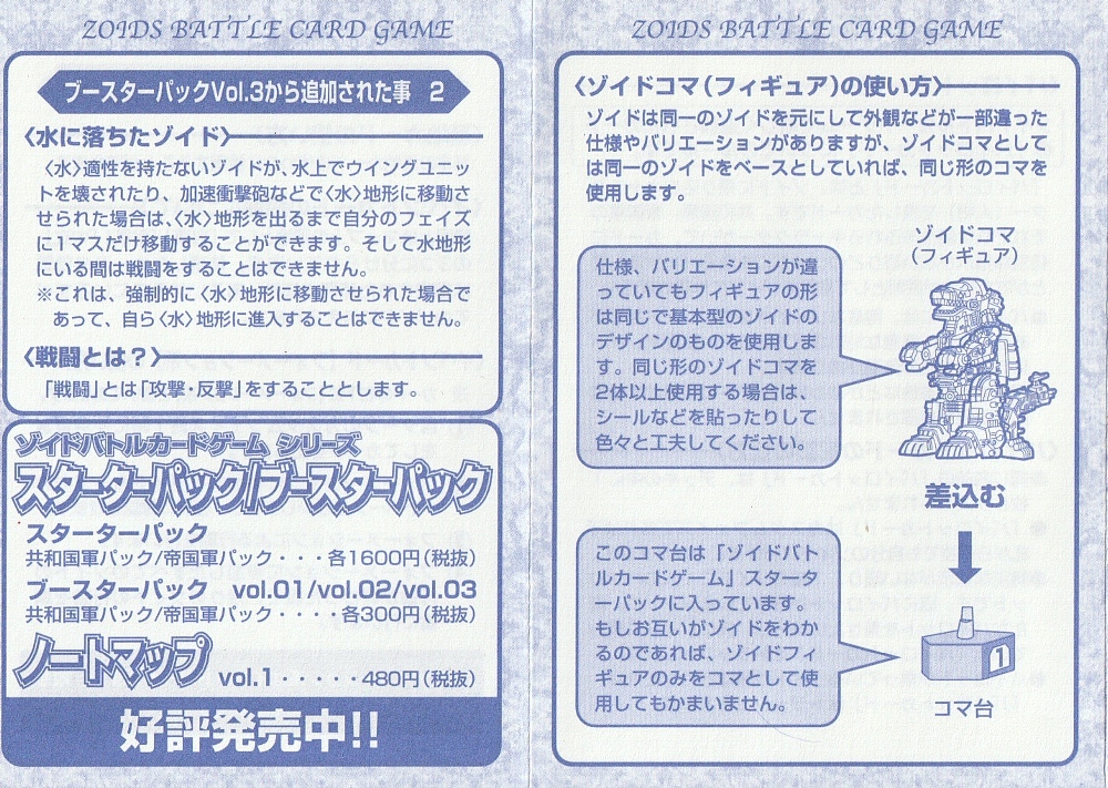 | ↑ブースターパック3付属の小冊子。今までの説明に加えて基地、イベントカードの範囲、フォーメーション効果、水に落ちたゾイドの説明が追加されました。ここから2つ折りから3枚折りになります。 |