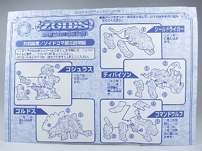 ←ゾイドコマ説明書。ゾイドコマの組み立て説明書です。ニッパーなどで切り取り、組み立てます。3パーツ前後の簡単な作業なので説明書を無くしても問題ないです。 |