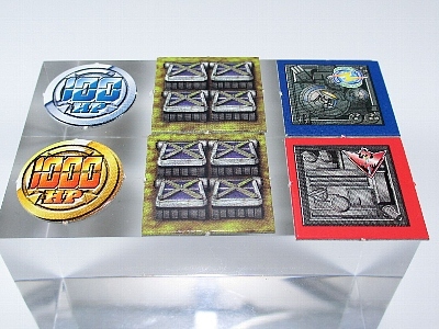 ←基地チップ、バリケードチップ、HPコイン。紙製ですが、1つのスターターに1000HPコインは15枚、100HPコインは102枚入っています。 |