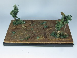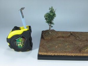 ←枯れ木との接着。適度の大きさに切った枯れ木の上に水ゴケを付けます。こちらも木工ボンドで大丈夫です。ゾイドは1/72スケールですので、普通の木なら立ちパイロットの3、4倍ぐらいの高さがいいでしょう。 |