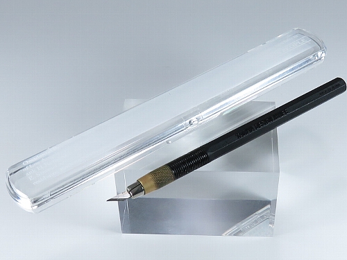 ←デザインナイフ(タミヤ) ゲート処理時に活躍します。専用ケースは無く非常に鋭利なので100円均一の箸ケースに入れています。 |