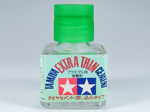 ←タミヤセメント流し込みタイプ こちらは通常の有機溶剤の入った流し込みタイプのセメント。 |