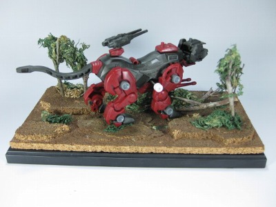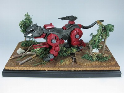 | ↑工夫したところ。草木を配置する場合、木の根元に生い茂る多数の草を配置。ゾイドの通り道には踏みつぶされたように草を配置してみました。 |