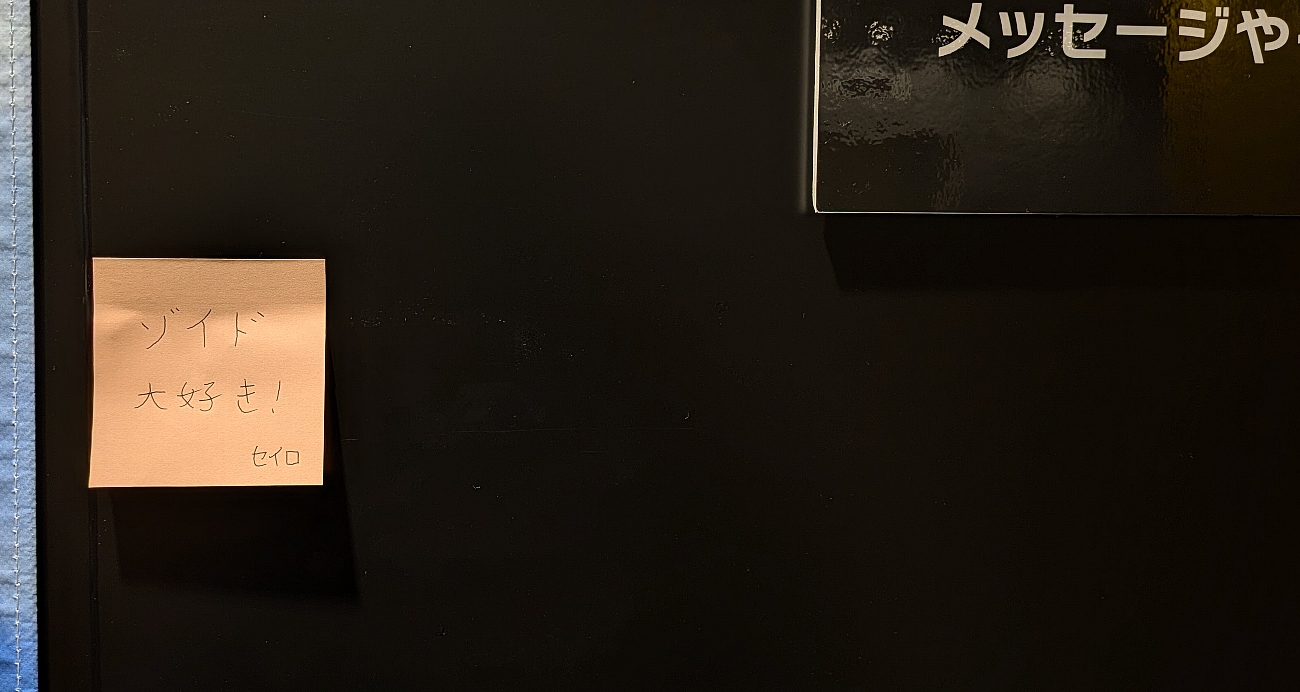 ↑応援のメッセージ1番乗り。鹿児島会場は開催初日に開店から突撃したので最速で左上隅に貼りました。その後、しばらくして見たら隣の方のグスタフメッセージが素敵でした。 |