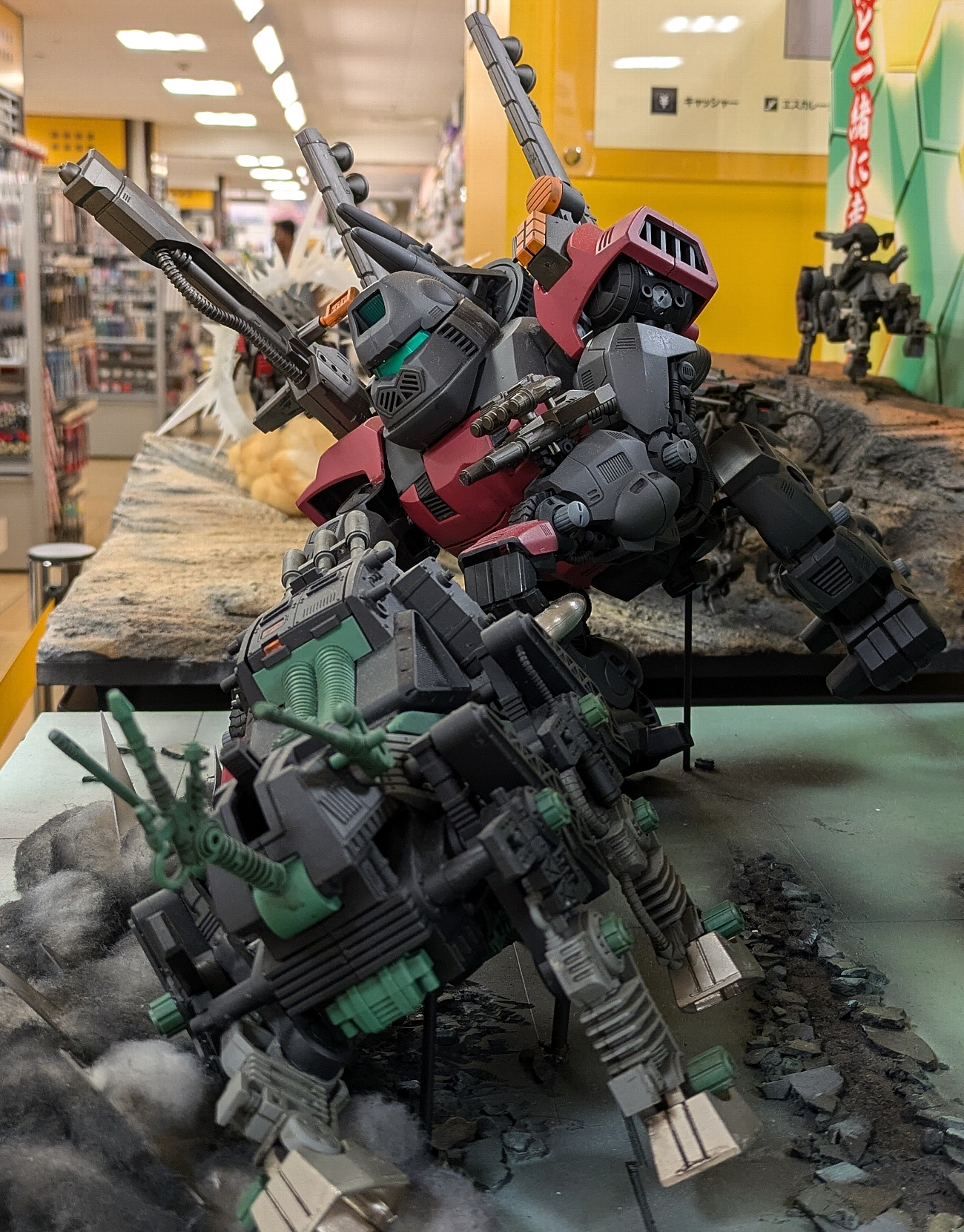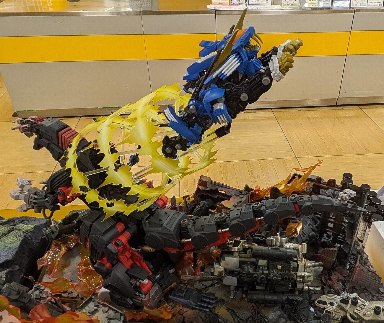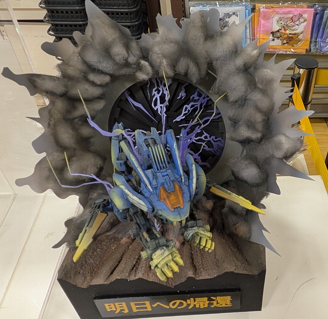 ↑ジオラマ。今までのジオラマは横4つ並びではなく、2つずつに分割されています。スペースの関係なんでしょうがこの配置は初めて。反対側からブレードライガーを撮ることもできますが、レジに向かってカメラが向くので少し気を使います。 |