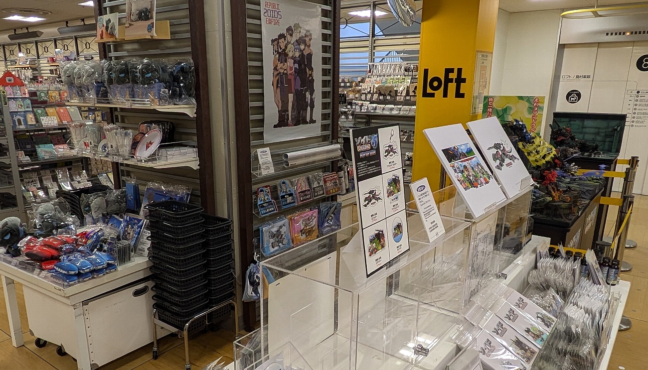 ↑静岡会場。池袋、梅田、松山に加えて、名古屋ご当地も復活。ただし、名古屋のデスザウラーキーホルダーは売り切れ。スペースの都合かジオラマのレイアウトが今までと微妙に違います。レジ、エレベーター近くにあり人目に付きやすいです。 |