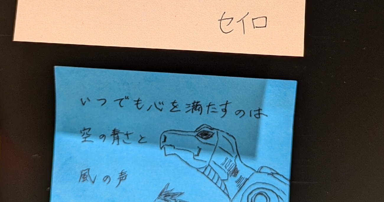 ↑応援のメッセージ復活。…相変わらず字が下手。他人のは掲載しませんでしたが、私の下の人が異常に上手かったです。全体は無しとしますが、バンも描かれていて、オープニングのイメージを付箋にしっかり描いていました。 |