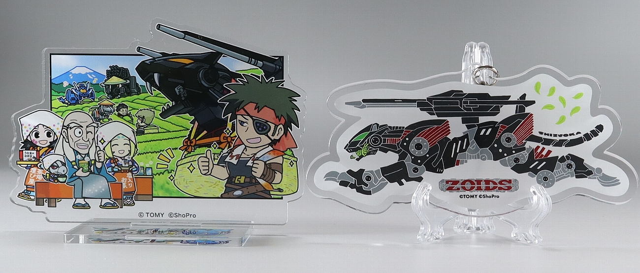 ↑静岡のご当地アクスタとキーホルダー。アクスタは富士山を背景に茶畑にみんなで来ている様子。新潟アクスタのアーバインはソロで、今回はみんなと描かれています。 |