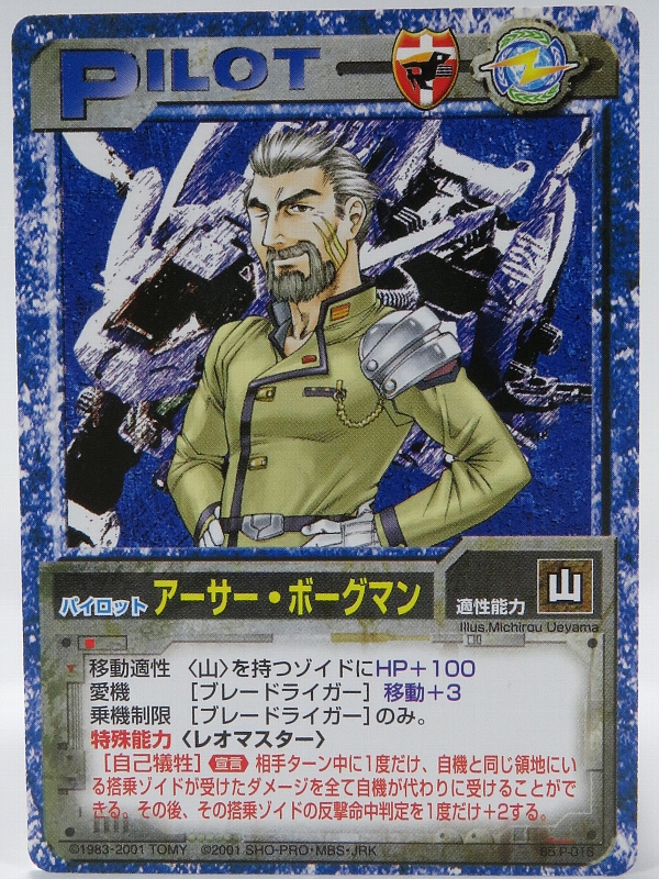 こちらはブースターパック5のパイロットカードで、山適正を持つゾイドにHP+100、ブレードライガーの移動+3、乗機制限ブレードライガーのみ。 |
