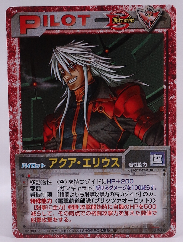 こちらはブースターパック6のパイロットカードで、空適正ゾイドにHP+200、ガンギャラドのダメージを100減らし、乗機制限は格闘よりも射撃攻撃力が高いゾイドのみ。特殊能力「射撃に全力」で攻撃開始時にHP−500すれば、格闘攻撃力を加えた数値で射撃攻撃が出来ます。 |