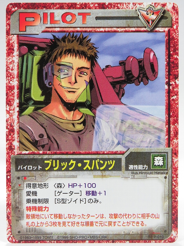 こちらはブースターパック2のパイロットカードで、S型ゾイド限定で、森適正ゾイドにHP+100して、ゲーターの移動力を+1することが出来ます。特殊能力で敵領地にいて移動しなかったターンは、攻撃する代わりに相手の山札の上から3枚見て好きな順番で戻すことが出来ます。 |