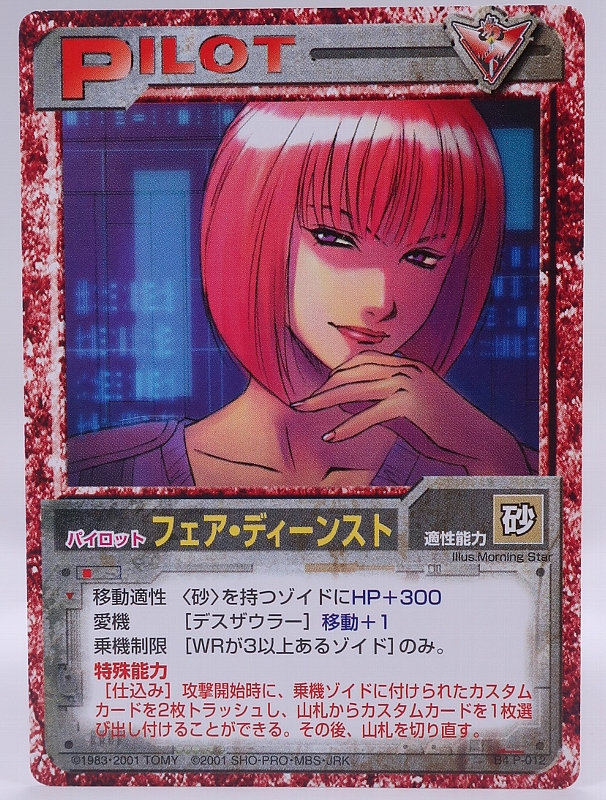 こちらはブースターパック4のパイロットカードで、砂を持つゾイドにHP+300、デスザウラーに移動+1、WRが3以上あるゾイドのみ登場できます。特殊能力「仕込み」は乗機ゾイドのカスタムカードを2枚トラッシュして、山札から直接任意の1枚を付けることが出来ます。 |