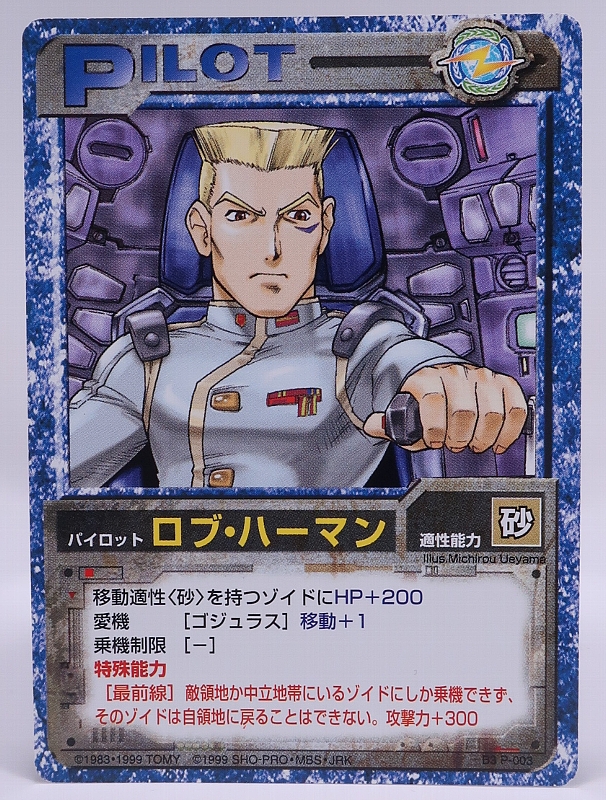 こちらはブースターパック3のパイロットカードで、砂適正を持つゾイドにHP+200、ゴジュラスの移動+1、乗機制限なしで、特殊能力「最前線」で敵領地か中立地帯にいるゾイドにしか搭乗できず、そのゾイドは自領地に戻ることは出来なくなりますが、攻撃力+300されます。 |
