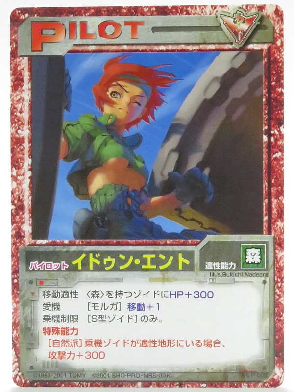 こちらはブースターパック4のパイロットカードで、S型限定パイロットで、森適正ゾイドにHP+300して、モルガには移動力+1 さらに特殊能力「自然派」で適正地形にいる場合は攻撃力が+300されます。 |