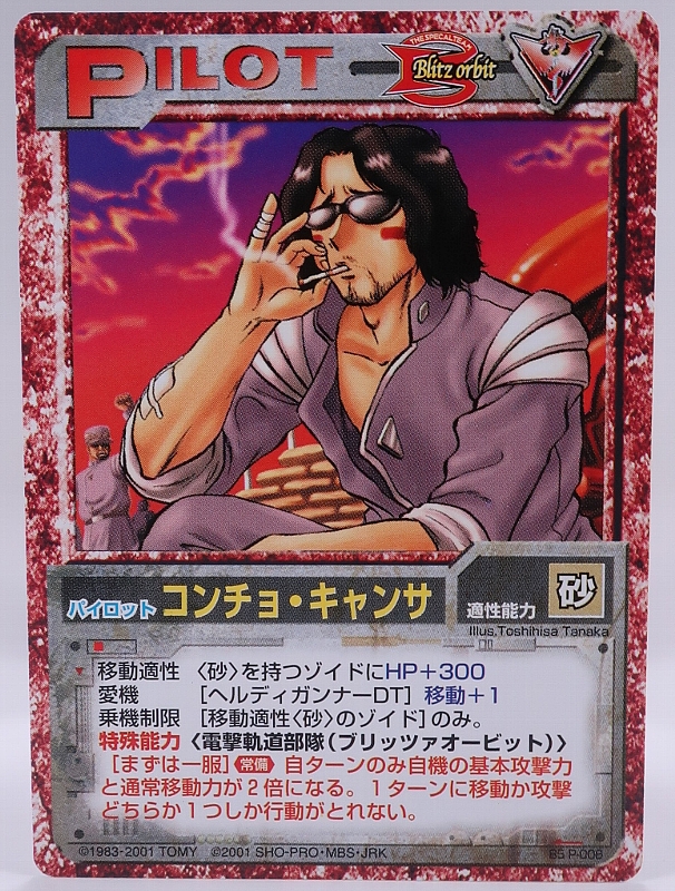 これもぶっ壊れのパイロットの1枚だ。特殊能力に目が行くが、乗機制限が砂適性のみなのでジェノブレイカーでもデススティンガーでも普通に乗れる。乗機対象が多いのもポイントだ。 |