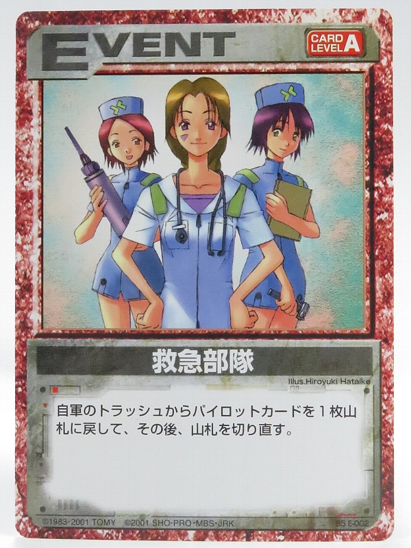 失礼しました。こちらはブースターパック5に登場したイベントカードです。トラッシュになったパイロットカードを山札に戻して再利用することが出来ます。同名のパイロットカードはデッキに1枚のみですが、このカードで再利用できます。 |