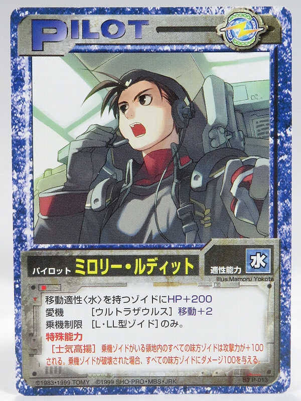 こちらはブースターパック3のパイロットカードで、水を持つゾイドにHP+200、ウルトラザウルスの移動+2、乗機制限でL、LL型のみ。特殊能力「士気高揚」で搭乗ゾイドがいる領地内のすべての味方ゾイドは攻撃力が+100され、乗機ゾイドが破壊された場合、すべての味方に100ダメージが入ります。 |