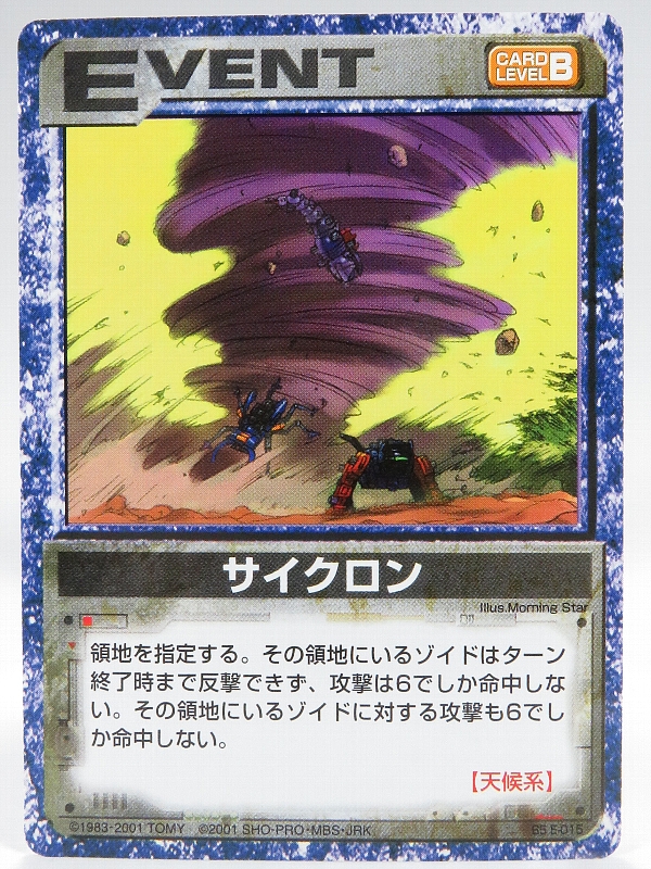 サイクロンはブースターパック5の天候系のイベントカードで、領地を指定して、その領地内にいるゾイドはターン終了時まで反撃できず、攻撃も6でしか命中しなくなります。さらにその領地内にいるゾイドに対しても6以外で命中しなくなります。 |