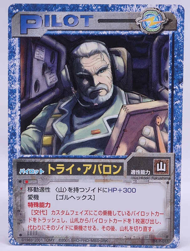 こちらはブースターパック4のパイロットカードで、山適性を持つゾイドにHP+300して、特殊能力「交代」で自身をトラッシュして、山札から直接任意のパイロットカードを自機に搭乗させることが出来ます。 |
