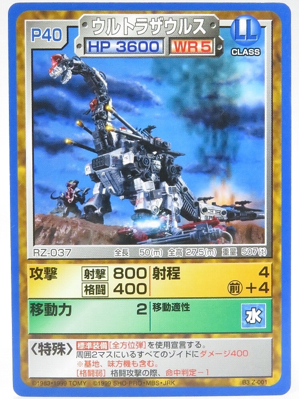 こちらはブースターパック3のゾイドカードで、史上初のLL型として注目されました。移動力と格闘を捨てて、射撃力、HP、WRが高いのが特徴です。後のブースターパック5でLL型のギルベイダーとマッドサンダーも登場しました。 |