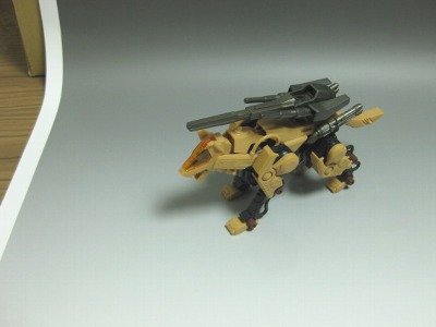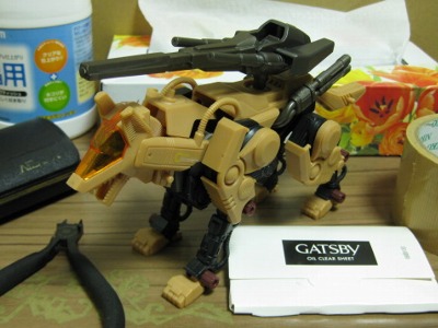 ↑いくら綺麗にゾイドが組み上がっても、背景に私物が写るとせっかくの写真が台無しになります。2枚目の写真は周りを片付けたとはいえ、机の模様や左端の白いものが少し気になります(白いものの正体は1枚目の写真の油取り紙のケース)。
