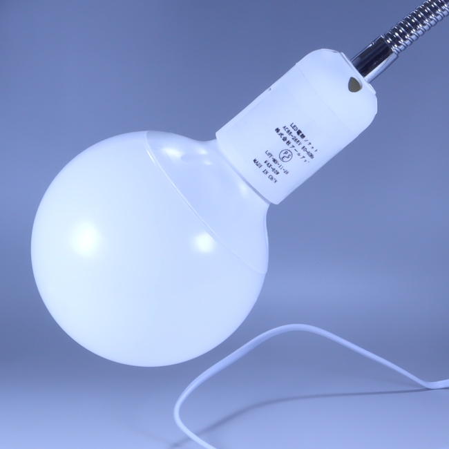 ↑LED電球。私の撮影環境は少し暗いのでボール型の100形相当の明るいものを使用していますが、元から十分な明るさがあるなら60形相当普通の電球でもいいと思います。色は「昼光色」(青みのある強い白)を使用しています。「昼白色」(優しい自然な白)でもいいでしょう。通常の電球よりボール型の方が光が拡散されるようです。 |