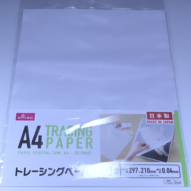 ↑トレーシングペーパー。本来の用途は複写ですが、光を拡散させる性質があるので使用します。画材売り場以外に100円ショップでも買えます。 |