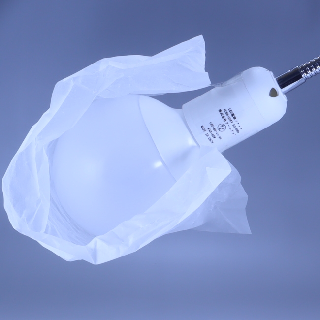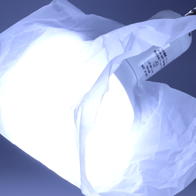 ↑クリップライトにLED電球を取り付け、光を拡散させるためにクシャクシャにしたトレーシングペーパーを被せます。写真は分かりやすくするためセロテープで雑に付けています。 |