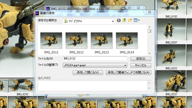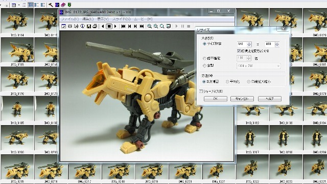 ↑こちらはリサイズというサイズ変更機能。ゾイドは結構、横長なものが多いので、デジカメの標準縦横比率は変更せず使用しています。ただ、ゴジュラスやフィギュアなどは縦長ですので、画像も縦長なものにしています。