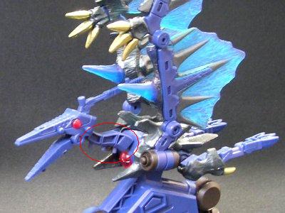 ↑首が逆だー! フレームの首の部分が上下逆についています。このため首があまり上がらなくなっています。右の画像が正しい首位置です。このパーツは頭部に挟み込まれるように組まれていて、直すには接着済みの頭部を分解し組み直さなくてはいけません。この画像ではバイオプテラを紹介しましたが、他に「パーツが入っていない」、「開封時からパーツが破損していた」、「あるパーツが余計に入っていて別のパーツが足りない」、「ちゃんと組み立てたのに動かない(動力部不良)」などのケースも考えられます。 |