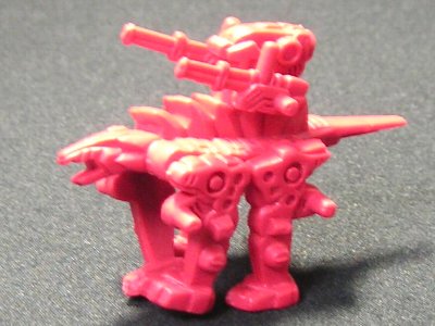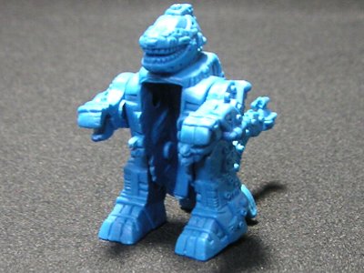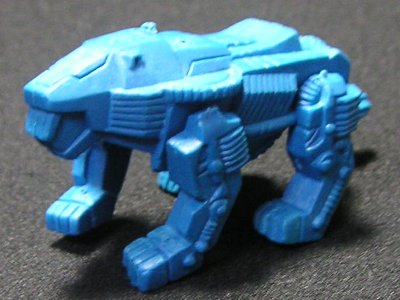 ↑たぶん…ボルドガルド。大きさが他のゾイドと同じで、足が長いので、出てきてしばらく何のゾイドか分からなかったです。ボルドガルドはキットしかモデルが出ていないので再現するのが難しかったのでしょう。背中のキャノンは可動可能ですが、ジョイント部の長さが適当なのでうまく入らないものもありました。こちらは赤の成形色ですが、特に色分けの基準はなく青いボルドガルドも出てきました。これも成形が悪く接地が不安定です。 |