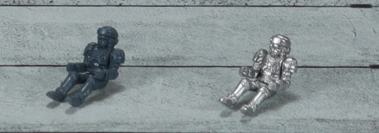 ↑メッキパイロット。一部のゾイドにはメッキのパイロットも付属します。右はネオブロックスのパイロット。基本パイロットより細身になっています。 |
