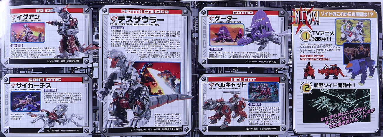 ↑新開発のゾイド情報。この時点ではジェノザウラーだと思いますが、写真の高速移動形態と格闘戦闘形態の変形ができるコンセプトは数年後に発売されたゴジュラスギガが受け継ぎました。 |