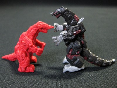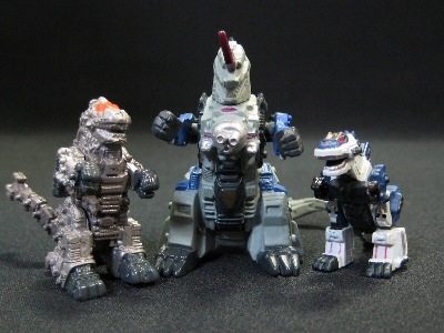 ↑キングゴジュラス。全ゾイドの頂点に君臨する最強ゾイド。首と腕が可動。ゾイドコレクションシリーズでも1体だけ200円ガチャかと思うような大きさとなっています。あまりに大きく分割してギリギリカプセルに入る大きさ。ゴジュラス機体と比べても写真の通り。ゾイドバトルカードゲームで未登場。パート9に収録