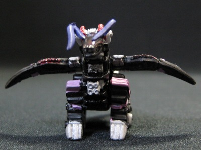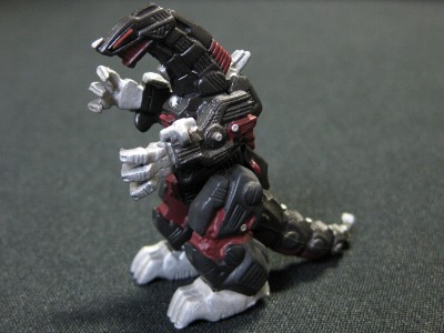 ↑デスザウラー。手足が可動するためある程度、ポーズをとれます。片足での自立は不可能。ゾイドバトルカードゲームのものより、よりアニメに近い形状でラインナップ。さらに背中は荷電粒子供給ファンと荷電粒子コンバーターのパーツが付属し、好きな方を取り付けられます。パート3に収録。