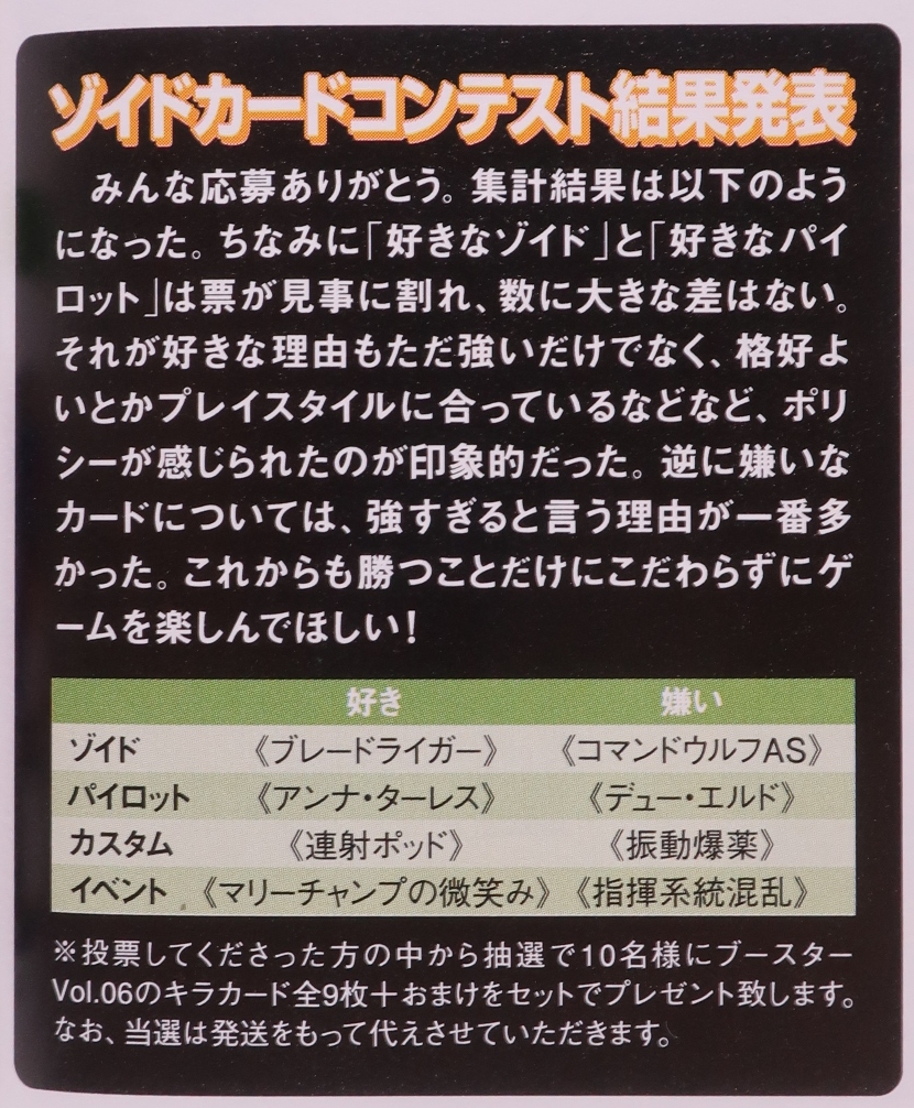 ゾイドカードコンテスト結果発表。ここでは好きなカードと嫌いなカードが掲載されました。実際のカードで好き嫌いな理由を予想で掲載してみました。管理人は実際の大会に出たわけではないし、ルールを間違えている可能性もありますが、ご了承ください。 |