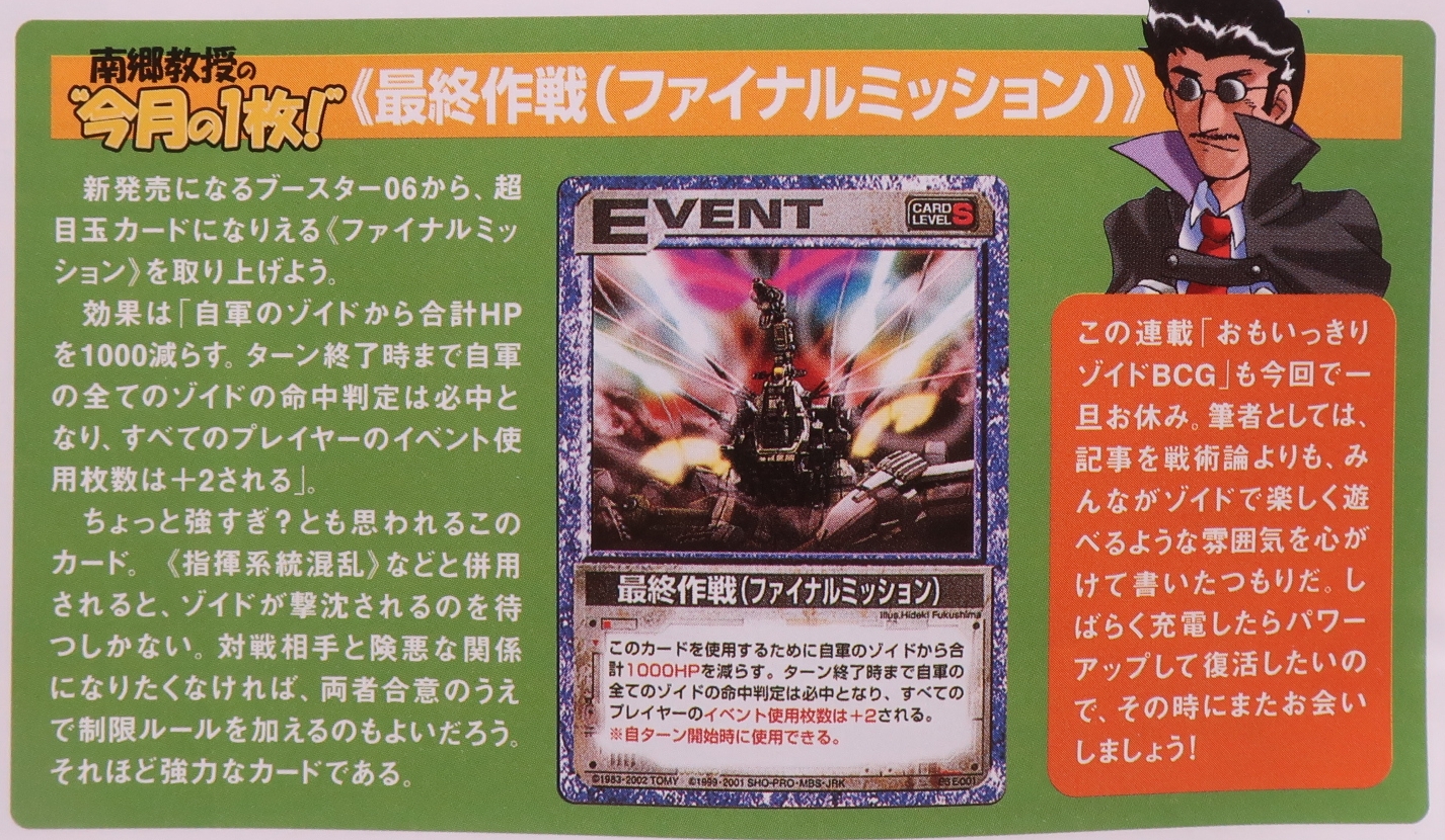 ↑ブースター6の最強カードことファイナルミッション。最後のブースターでまさかの全軍必中効果。自軍から合計HP1000を減らすことで、バランスを取っているかもしれませんが、減らす割合は自由に決められるので、逆に効果条件を満たしてしまいデメリットにならない場合も。指揮系統混乱と組み合わせはエンドカードレベル。 |