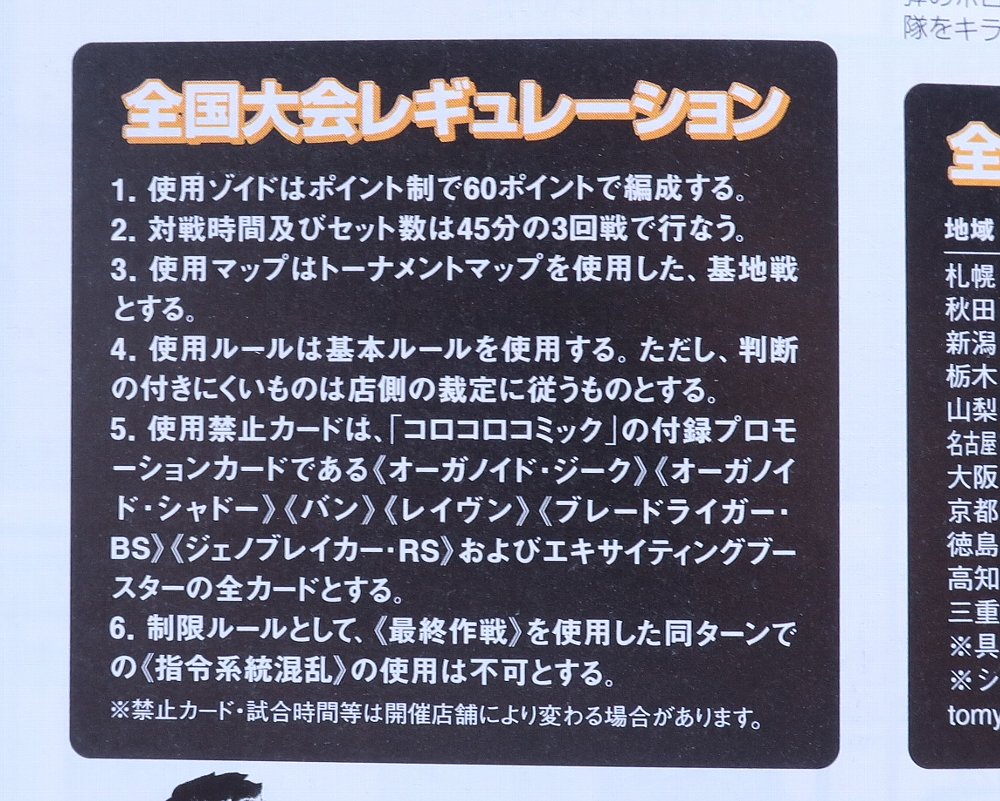↑ゾイドバトルカードゲームの全国大会のレギュレーション。さすがに強すぎるのでコロコロプロモーション系は禁止で、「最終作戦」(味方全員必中)の後に「指揮系統混乱」(イベントカード使用不可)も禁止でした。 |