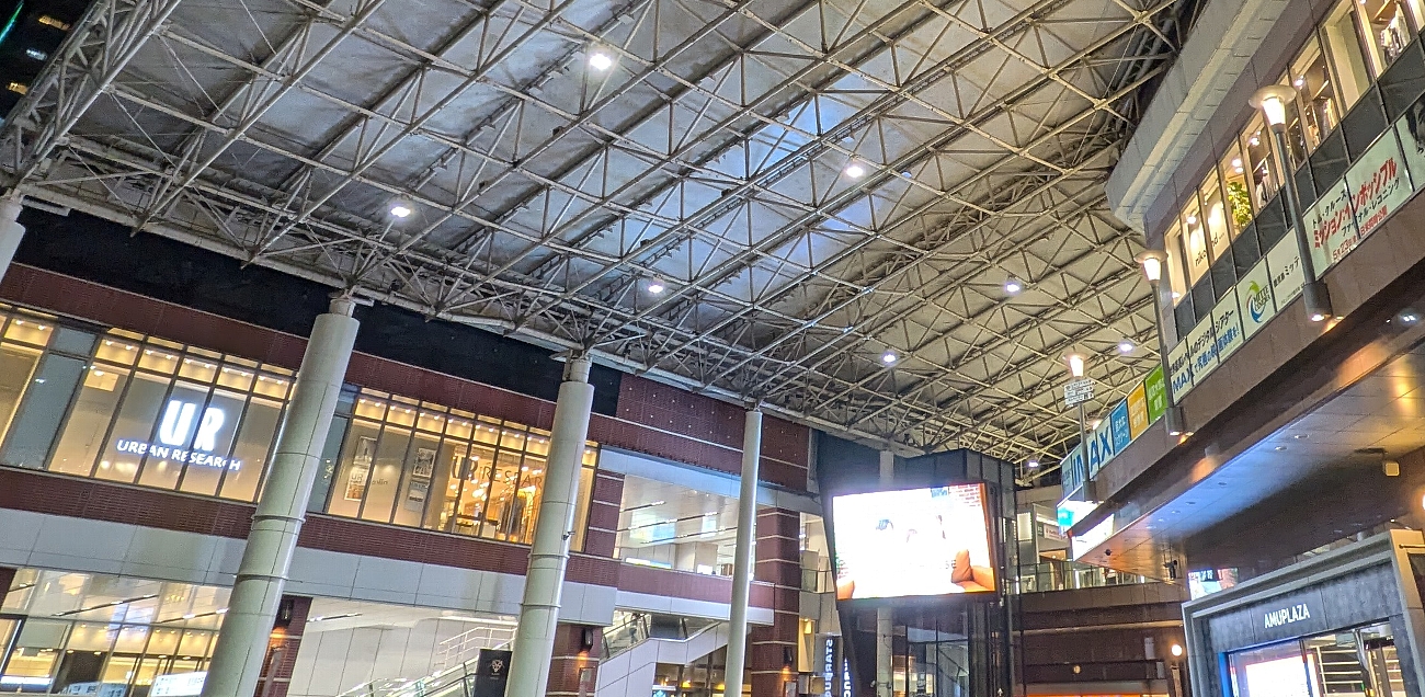 ↑天文館のアーケード。アーケードというと商店街、繁華街のメインストリートのみに展開しているイメージでしたが、天文館は桜島の降灰対策も含めかなり広範囲に展開しています。もちろん天気が変わりやすい梅雨であり、折りたたみ傘は持っていきましたが、この広範囲のアーケードは助かりました。 |