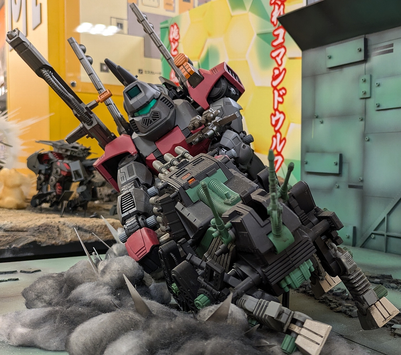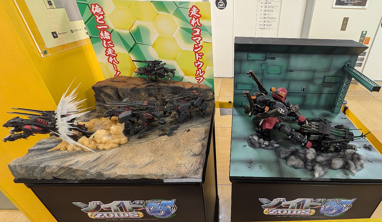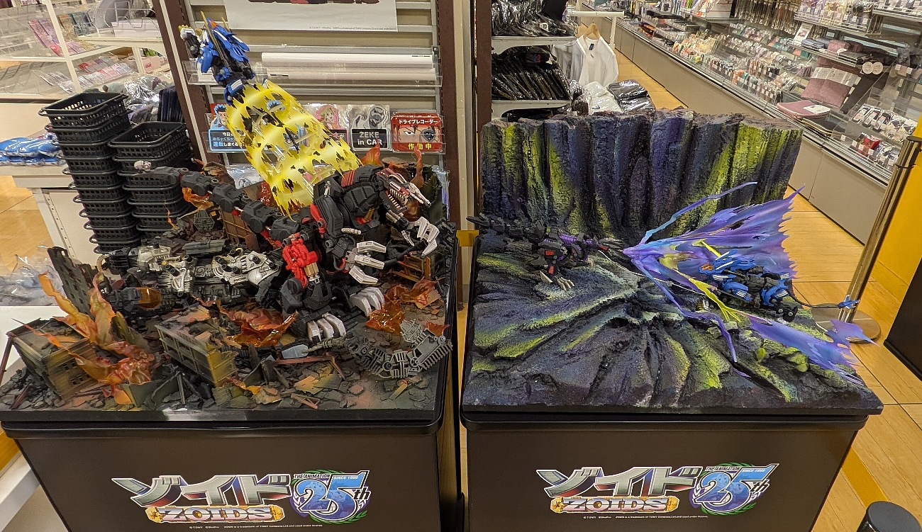 ↑ジオラマ。今までのジオラマは横4つ並びではなく、2つずつに分割されています。スペースの関係なんでしょうがこの配置は初めて。反対側からブレードライガーを撮ることもできますが、レジに向かってカメラが向くので少し気を使います。 |