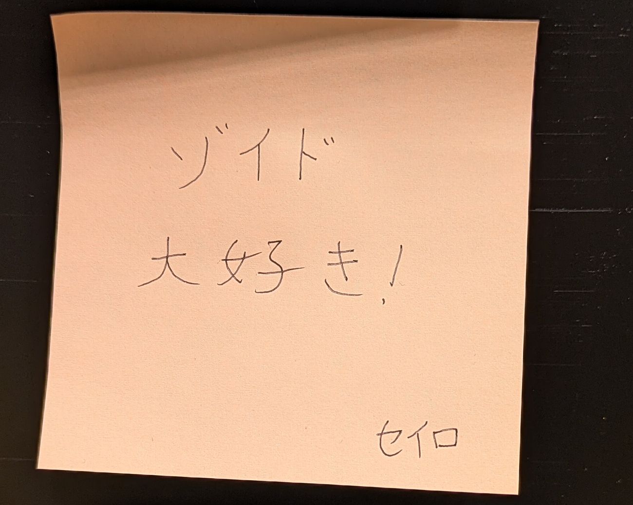 ↑応援のメッセージ復活。…相変わらず字が下手。他人のは掲載しませんでしたが、私の下の人が異常に上手かったです。全体は無しとしますが、バンも描かれていて、オープニングのイメージを付箋にしっかり描いていました。 |